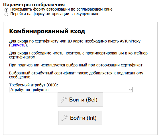 - В одном из поддерживаемых браузеров перейдите на страницу тестового магазина, в разделе Комбинированный вход, где указано «Для входа по сертификату или ID-карте необходимо иметь AvTunProxy», нажмите «Войти (Int)»: